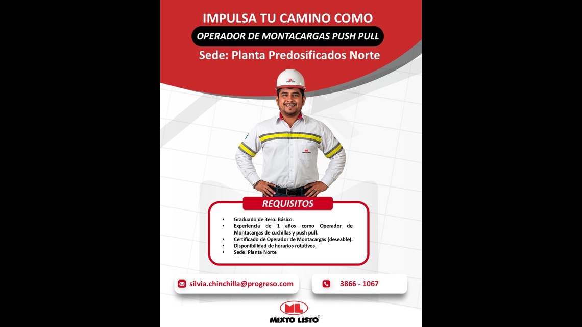 - Experiencia de 1 años como Operador de Montacargas de cuchillas y push pull.