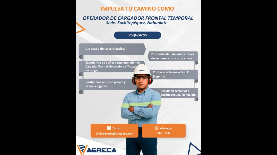Operador de Cargador Frontal Temporal/ Suchitepéquez, Nahualate Agreca - Agreca
