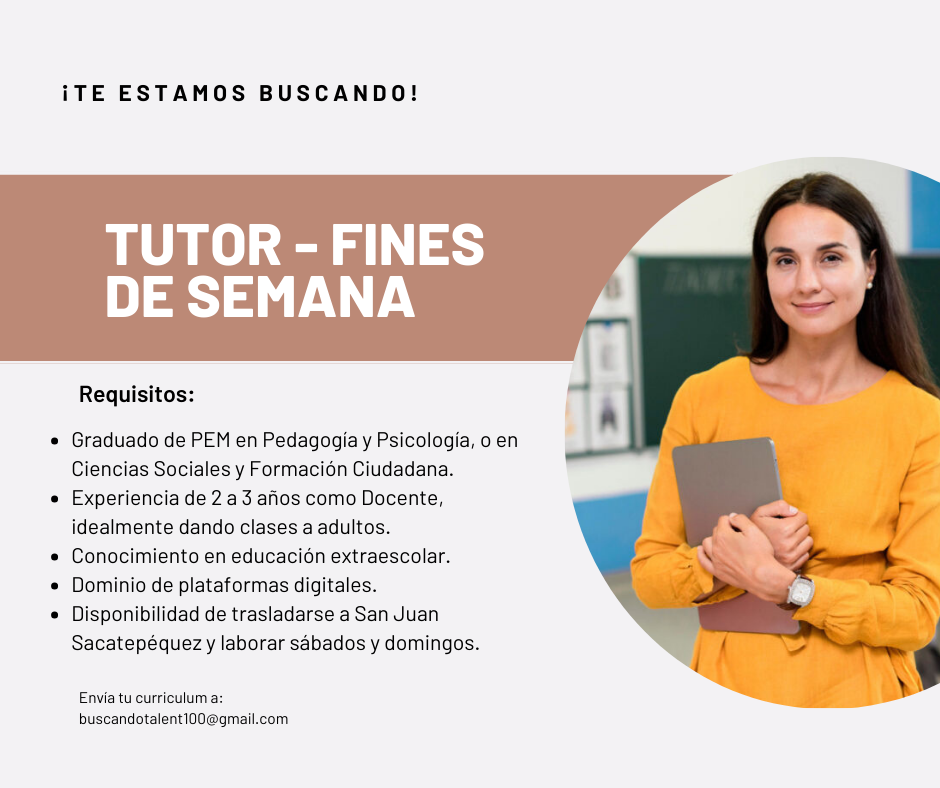 - Disponibilidad de laborar en San Juan Sacatepéquez tiempo completo los sábados.